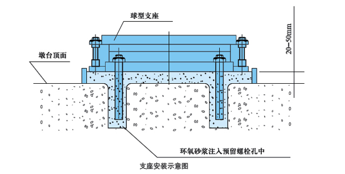 b、安裝支座及地腳螺栓:在下支座板四角用鋼楔塊調(diào)整支座水平,并使下支座板底面高出橋墩頂面 20 - 50mm,找正支座縱、橫橋向中線位置,使之符合設(shè)計要求。用環(huán)氣砂漿灌注地腳螵栓孔及支座底面墊層 (見下圖>。