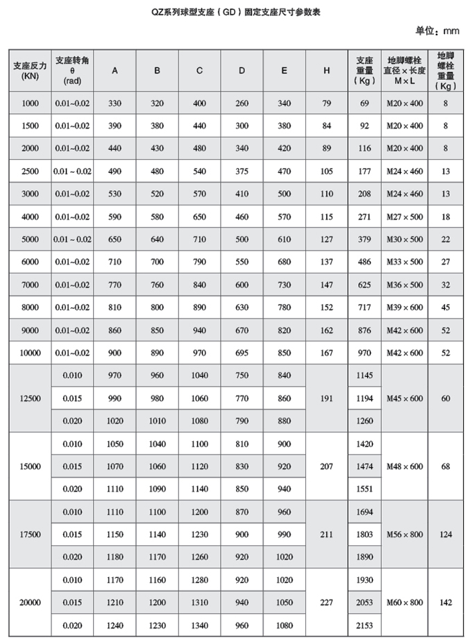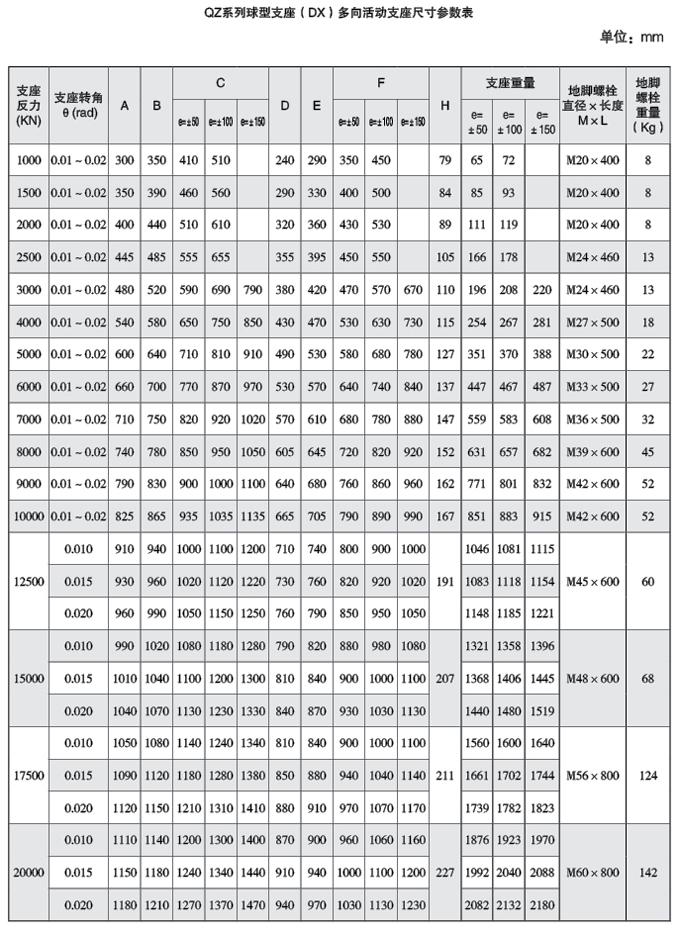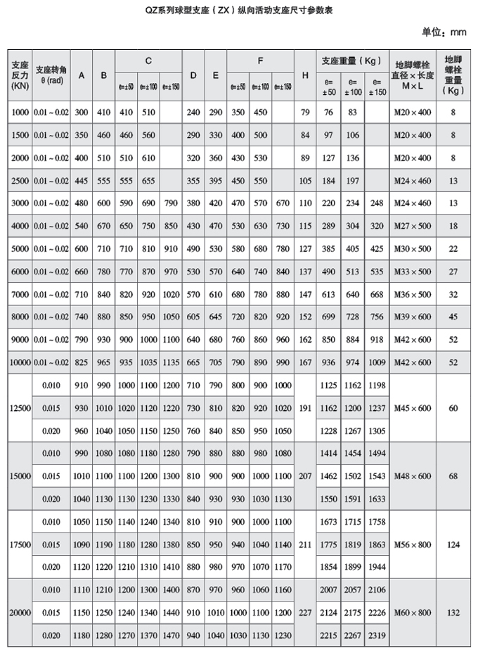 3、QZ系列球型支座的主要技術(shù)性能: a、支座反力(豎向承載力)分為 16級:1000、1500、2000、2500、3000、4000、5000、6000、7000、 8000、 9000和10000、 12500、 15000、 17500、 20000KN。